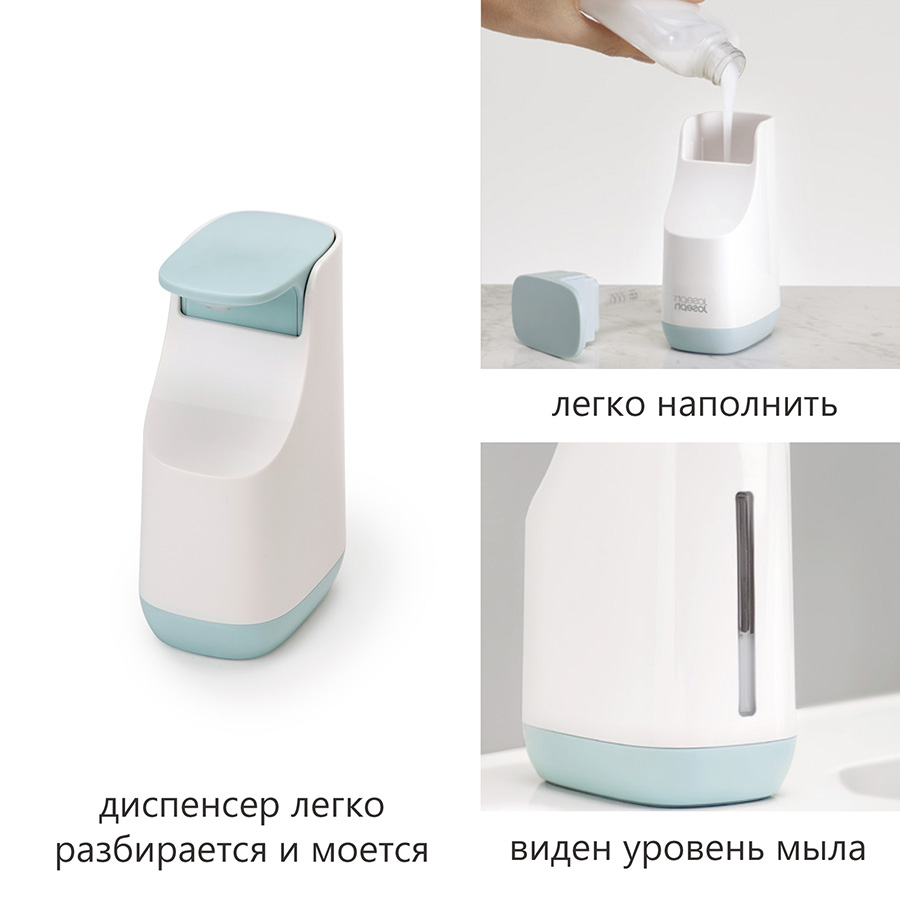 Широкая помпа легко нажимается, дозатор рассчитан на оптимальное количество мыла на каждый раз. На корпусе диспенсера предусмотрен выступ для капель и шкала для своевременного пополнения мыла. Диспенсер оснащен специальными силиконовыми ножками, которые придают ему дополнительную устойчивость на гладких поверхностях. Он легко разбирается и моется. Общий объем: 350 мл. Диспенсер отлично подойдет для ванной в современном стиле, его можно комбинировать с другими аксессуарами из коллекции Joseph Joseph.