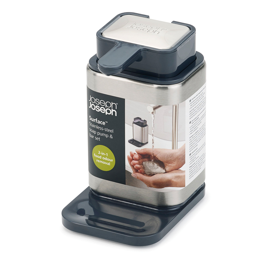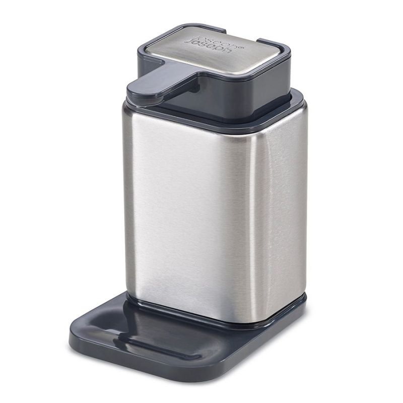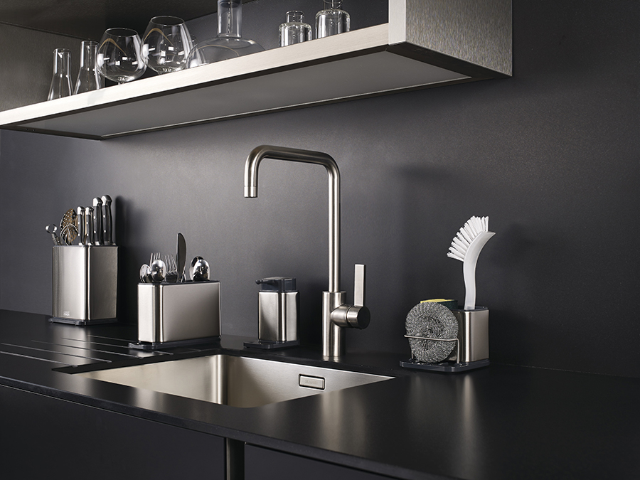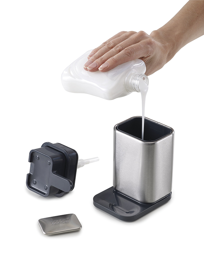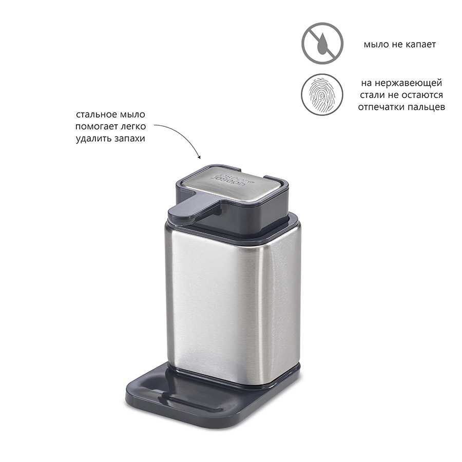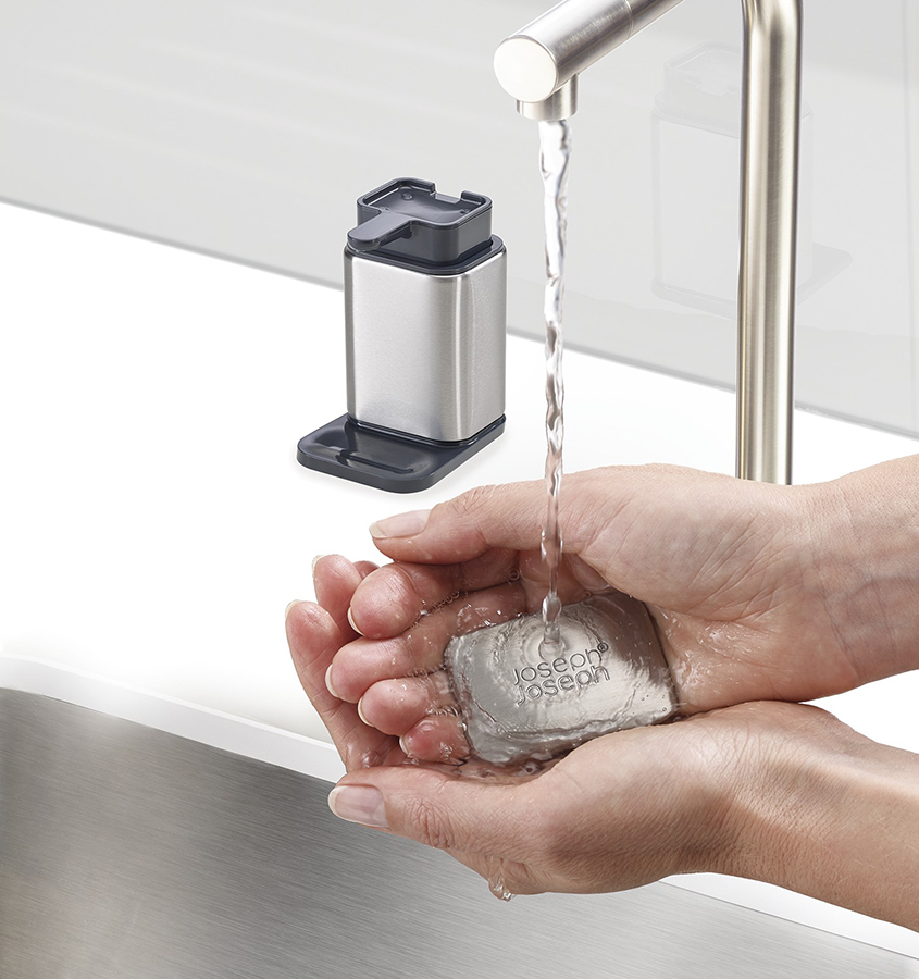 Стальное мыло помещается, в верхнюю часть емкости и не требует дополнительного места возле раковины. В нескользящей основе диспенсера предусмотрен выступ для капель из носика. Все предметы коллекции изготовлены из пластика с отделкой из стали класса SS430, хорошо известной своими антикоррозийными свойствами.