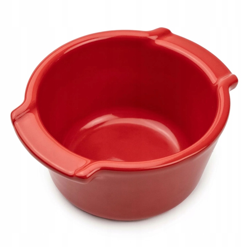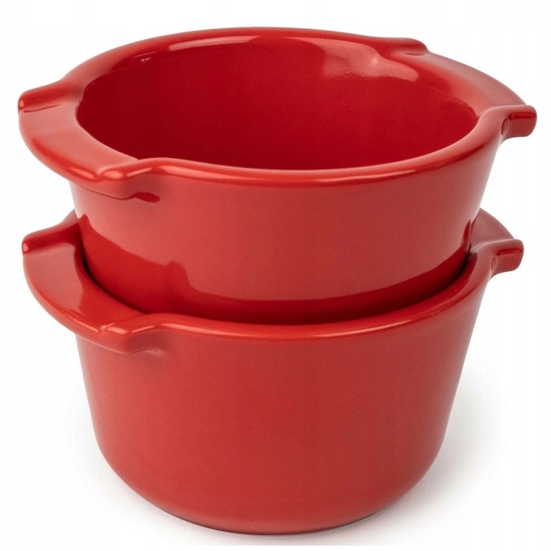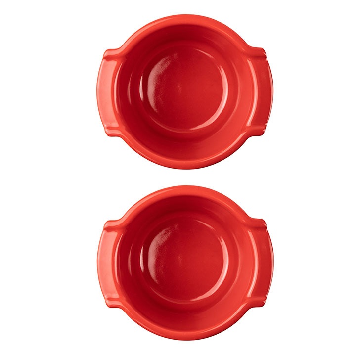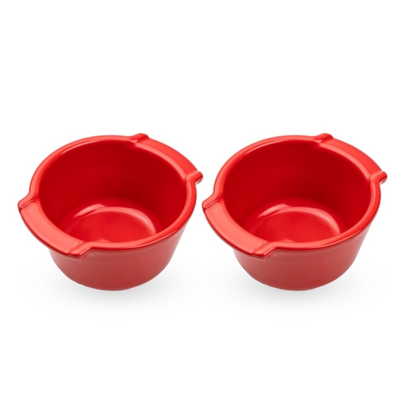 Два ярко-красных рамекина для приготовления блюд в духовке, микроволновой печи или морозильной камере.
