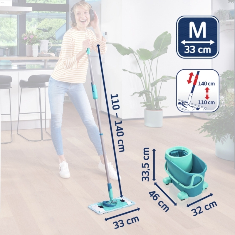 - Надежный шарнир на 360° в основании, швабры служит гарантией высокого уровня комфорта при уборке, позволяет мыть пол по серпантину и в труднодоступных местах. Телескопическая рукоятка швабры регулируется по длине (110 - 140 см), создавая максимально удобную высоту для безупречной работы. Тележка с вращающимися на 360° роликами и эргономичная ручка на ведре, обеспечивают удобное перемещение системы по помещению. Ведро предусмотрительно оснащено держателем швабры и специальным носиком для слива грязной воды.