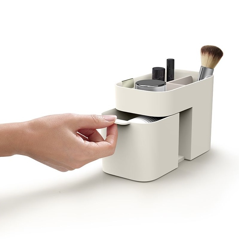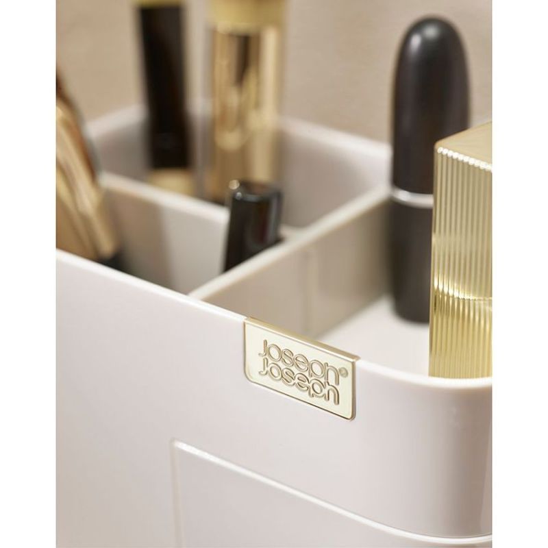 Органайзер включает несколько отделений разной глубины, а также большой ящик. Глубокие отделения подойдут для хранения кистей, туши и карандашей. Отделения меньшей глубины - для таких предметов, как бальзамы для губ, румяна и тени для век. Органайзер легко разбирается для очистки.