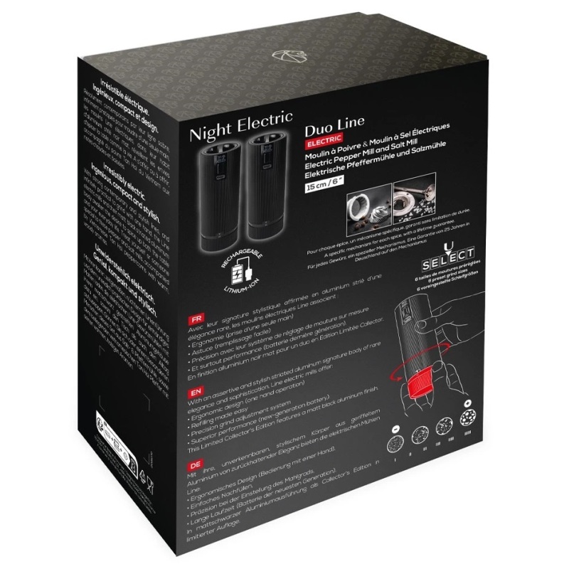 Электрические мельницы Line duo matte black с элегантным дизайном из полосатого алюминия и особенно стильным матово-черным покрытием привносят изобретательность на каждом этапе использования, от наполнения до измельчения. При этом была учтена каждая деталь: компактная конструкция для оптимального захвата, длительное время автономной работы и быстрая зарядка благодаря использованию литий-ионного аккумулятора последнего поколения, интуитивно понятное наполнение с помощью воронкообразного резервуара.