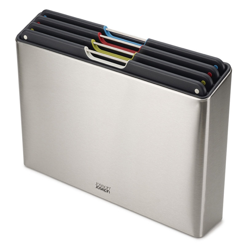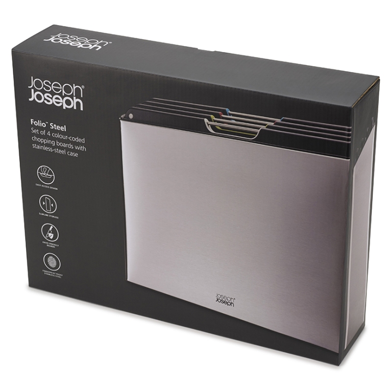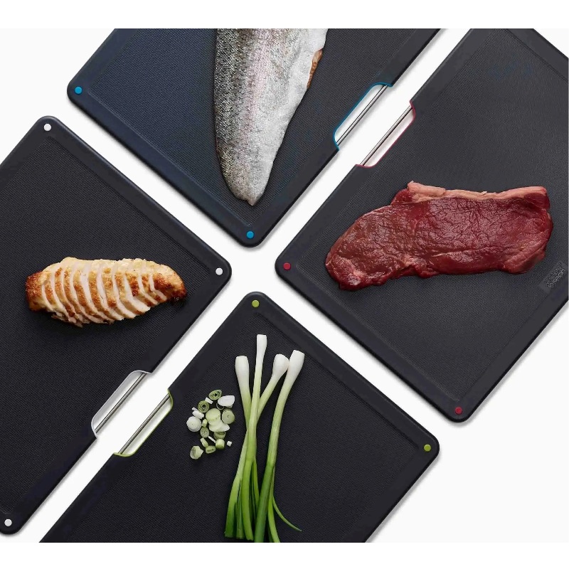 В комплект входит 4 черные доски 34x24см с закругленными углами и нескользящими ножками. Небольшие края по контуру удерживают сок и крошки нарезаемых продуктов. При создании изделий мастера используют высококачественный пластик, который не затупляет ножи и при резке не оставляет микроскопических частиц на пище. На текстурированной поверхности досок не заметны царапины. Простая и вместе с тем эффективная цветная кодировка позволяет легко распределять доски для разных типов продуктов, сохраняя максимальную гигиену в процессе нарезки и исключая взаимное загрязнение продуктов.