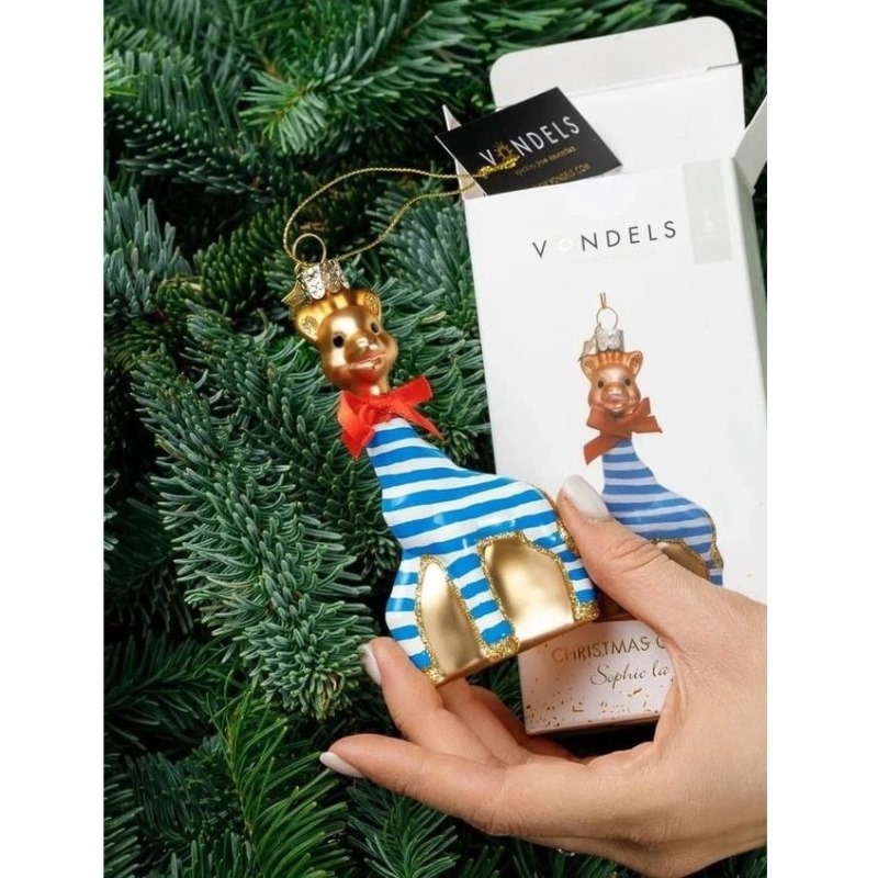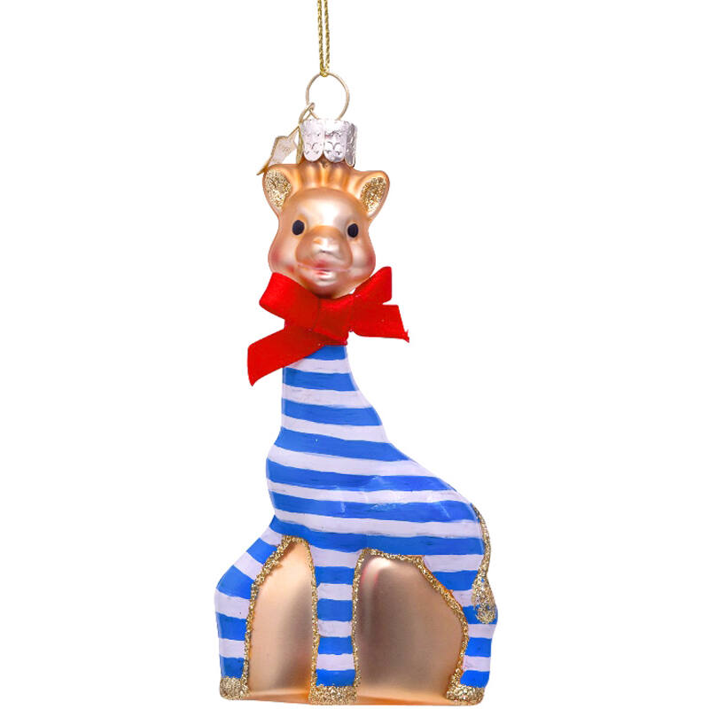 Елочное украшение в форме очаровательного жирафа в тельняшке высотой около 10 сантиметров упаковано в фирменную белую подарочную коробочку, станет приятным подарком для вас и ваших близких.