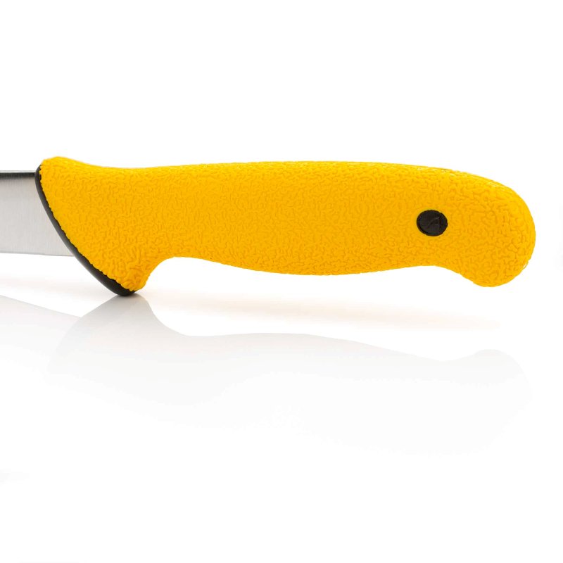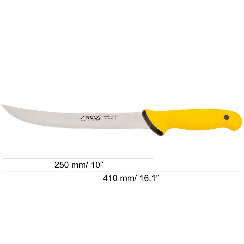 - Изогнутое лезвие для точных надрезов: Специально разработанное изогнутое лезвие длиной 250 мм идеально подходит для точных надрезов вокруг костей и суставов. Эта отличительная особенность упрощает процесс разделки мяса и филе, позволяя без особых усилий получать чистые и равномерные надрезы.