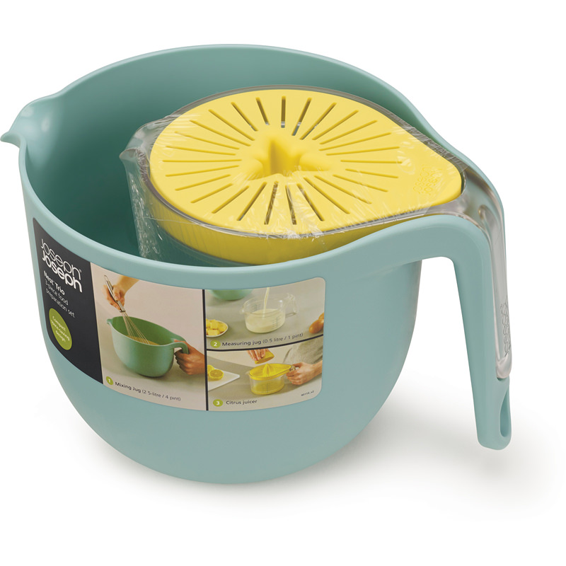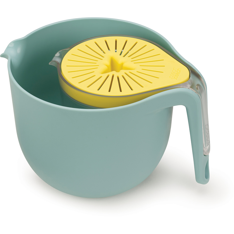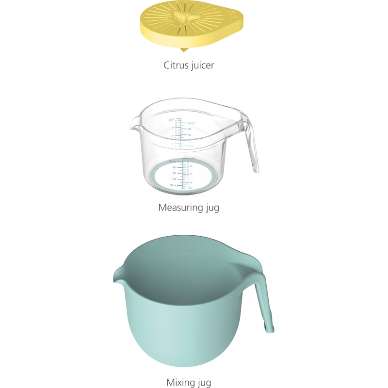 Емкости компактно складываются, имеют эргономичные носики, вертикальные ручки и нескользящие основания. Соковыжималка для цитрусовых соединяется с мерной чашей для удобного использования. Аксессуары аккуратно складываются вместе для компактного хранения. Емкость для смешивания - 2,5л, мерная чаша - 0,5л.