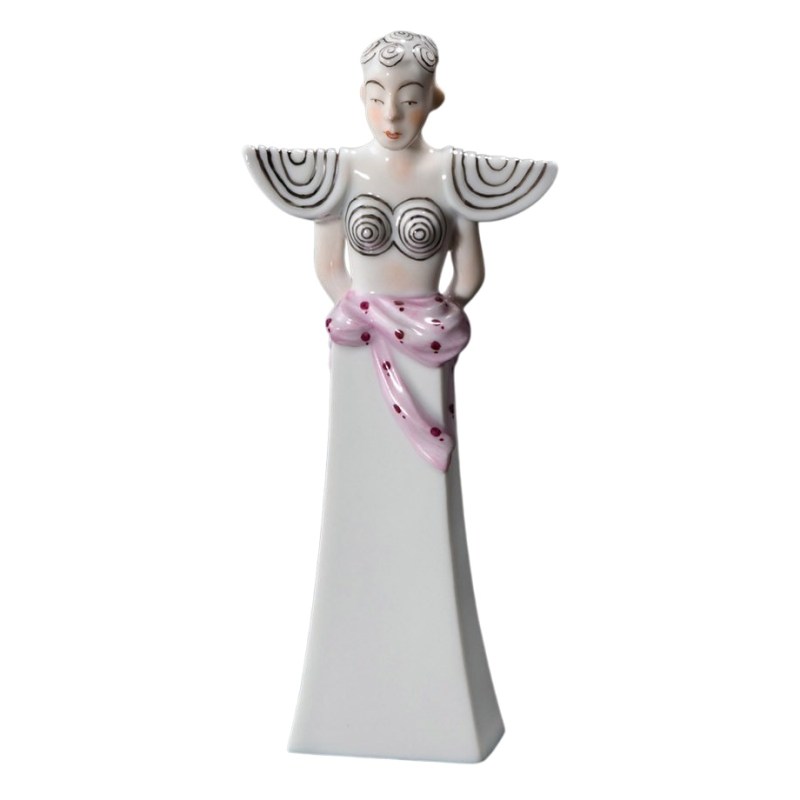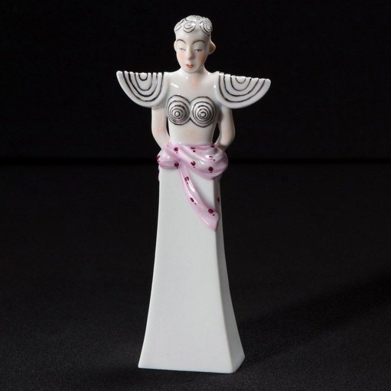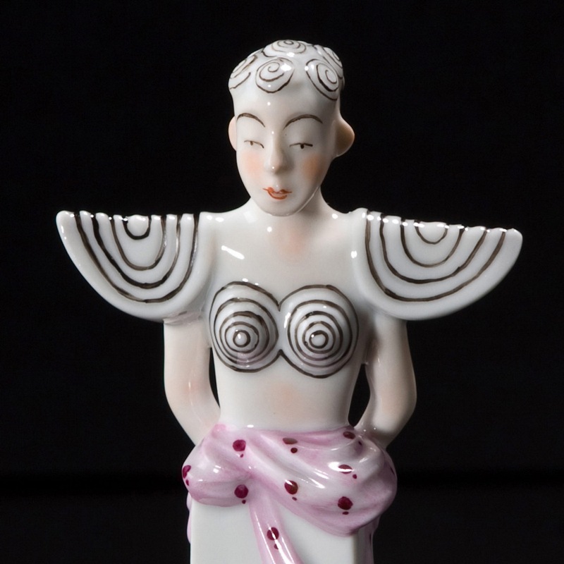 Фигурка выполнена из глазурованного фарфора, который украшает ее цветными узорами.